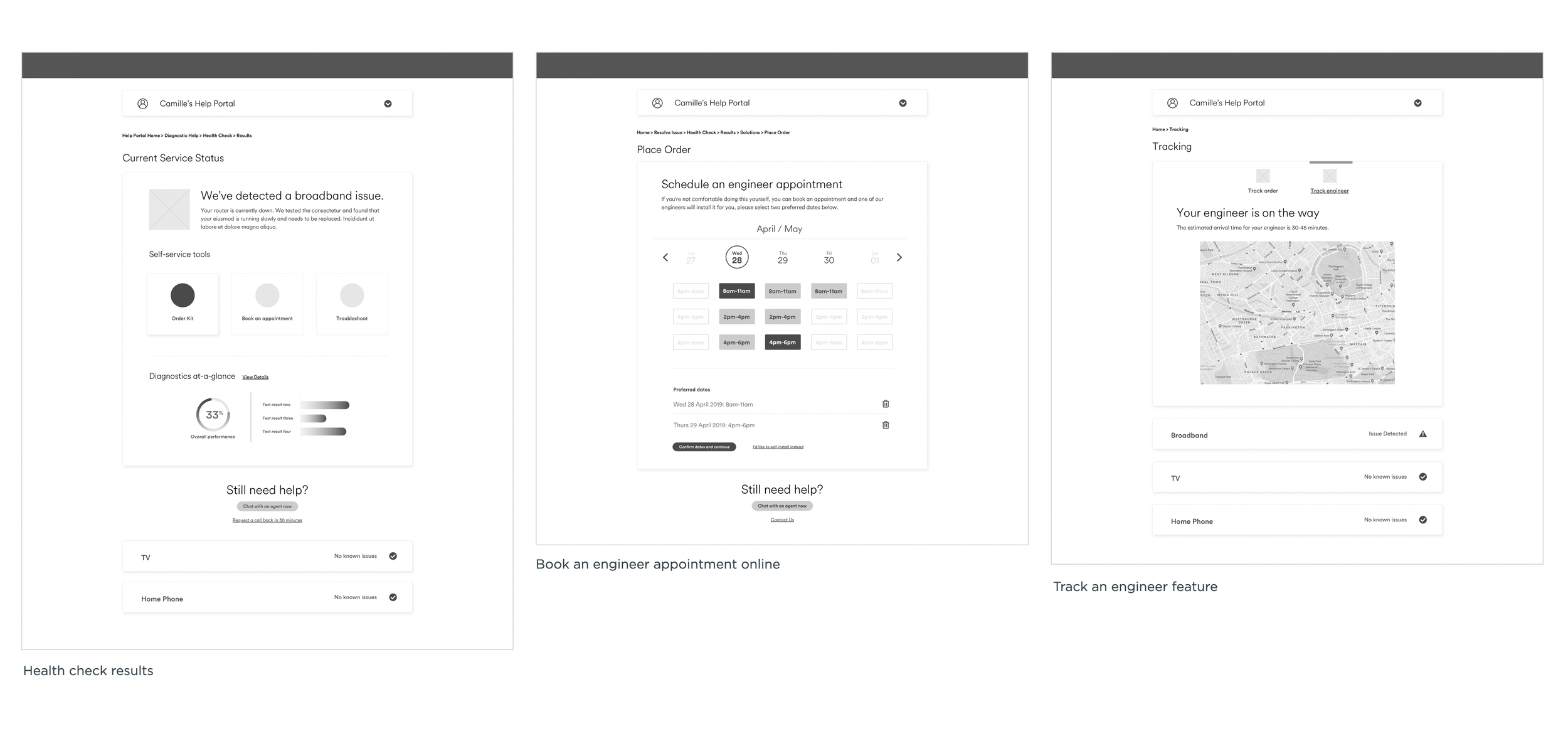 From left to right: We tested several features, including — Screen 1: a dedicated help portal; Screen 2: a diagnostic Q&A tool to quickly route users to the right solution; Screen 3: embedded payment options for resolving billing issues within the help center; Screen 4: a health check feature with diagnostic results to guide troubleshooting; Screen 5: online booking for engineer appointments; and Screen 6: real-time tracking to reduce wait times for scheduled engineer visits.