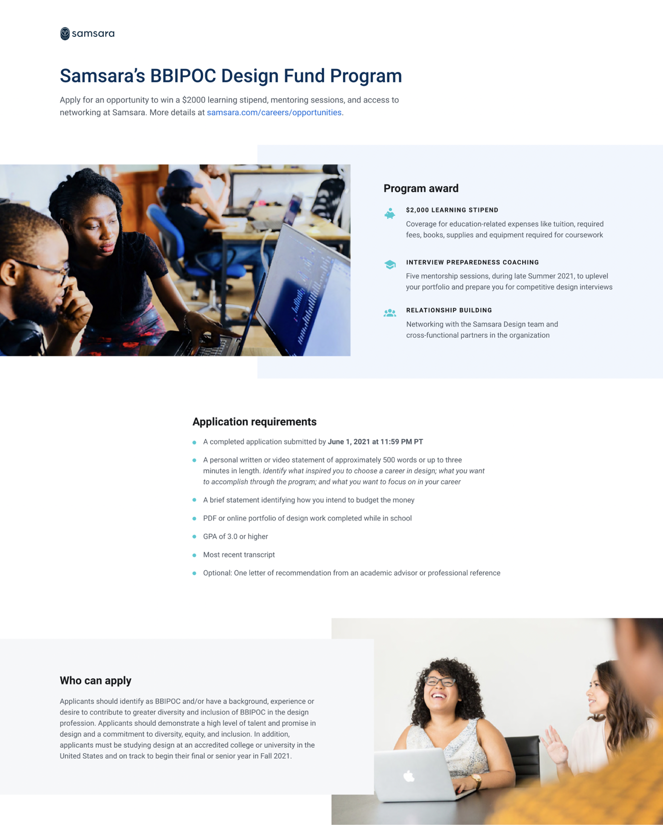 I founded and led the BBIPOC Design Fund, a first-of-its-kind mentorship program at Samsara built to expand access to product design opportunities in tech. Working with the support of ERG co-leads and stakeholders across Marketing, Legal, People Ops, Product Design, PR, and the DEI Steering Committee, I developed and pitched the program, secured executive buy-in, and guided its implementation. The initiative provided mentees with career resources, a learning stipend, one-on-one coaching from senior design ICs, and AMAs with design leadership — creating growth opportunities for both mentors and mentees.